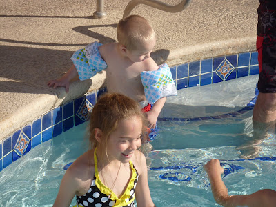 The next morning we took it kind of slow. We had the hotel's breakfast (it was okay) and then went swimming at 10:00 IN THE MORNING!!! It wasn't exactly warm, but it wasn't cold either and the pool was heated, so it was nice. The older kids LOVED it. Nate didn't want to be in a first, but eventually warmed up. Ailey really wasn't sure of it all at first, but by the end she was laughing and smiling and having a BALL!!!